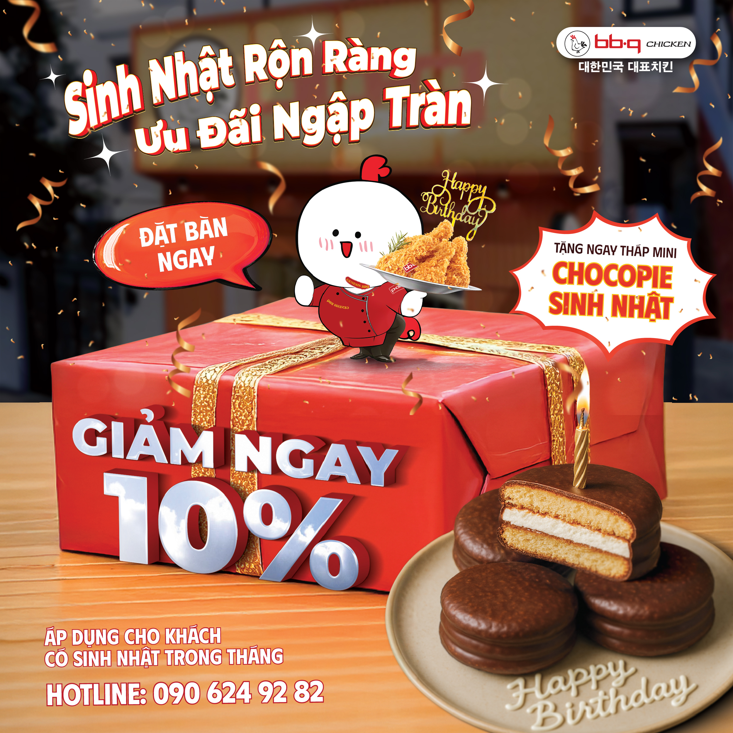 🔥Đặc biệt có voucher giảm 10% cho khách có sinh nhật trong tháng, gà Chi nhảy múa góp vui, bánh Chocopie,… cùng rất nhiều ưu đãi khi đặt tiệc sinh nhật tại bb.q Chicken đó nha!